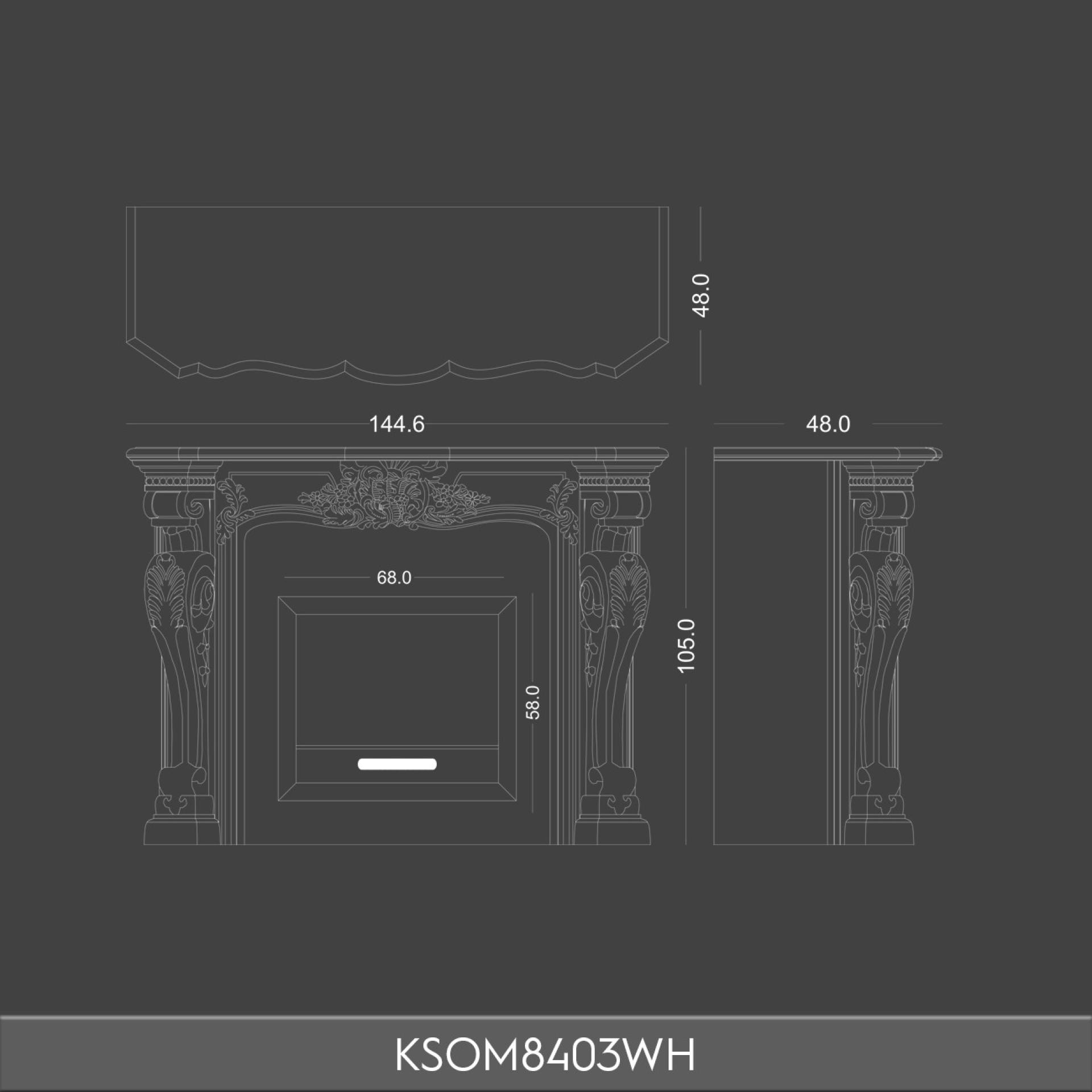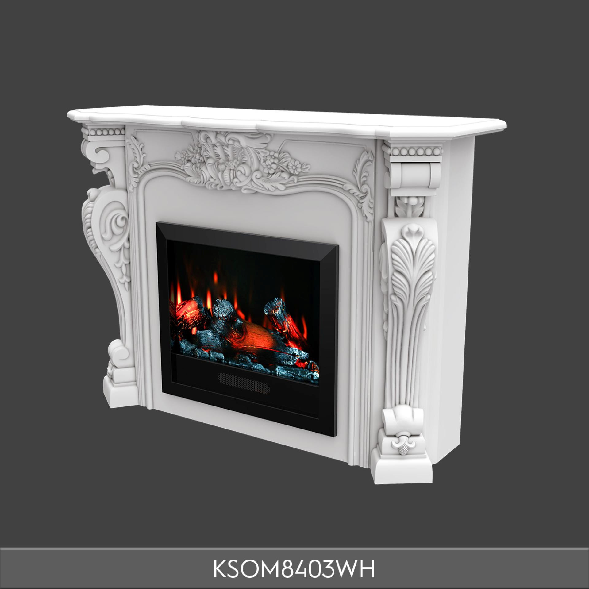 KSOM8403WH modeli, Poliüretan gövdesiyle hem klasik hem modern çizgileri birleştirir. Kavisli yüzeylere zarif çiçek kabartmaları işlenmiş, sütun detayları Korint tarzına göndermede bulunur. Parlak beyaz rengi, şömine alevinin sıcak tonlarını dengeleyerek yatak odasında ferah ve dengeli bir atmosfer oluşturur.
